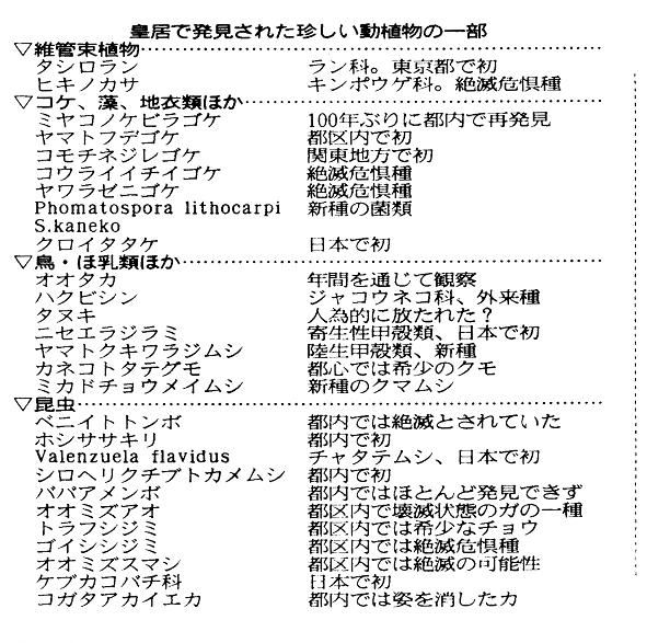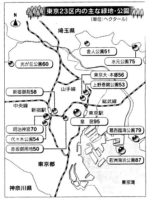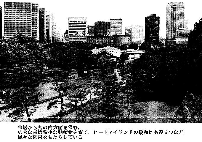 町なかで近年急増し、東京都内で三万羽までになったといわれるカラス。他の鳥を追いやり、 生態系を乱すだけではない。ごみ置き場に群がって食い荒らし、人を襲う例もある。東京都には 昨年度で約千三百件もの苦情が寄せられたほど。都は今月からプロジェクトチームを結成し、実 害の調査と解決に乗りだす。 ところが、都内でこのカラスが減っている地域がある。東京都千代田区千代田1−1。皇居だ 。 皇居の野鳥がカラス減らす 敷地全体で九十五ヘクタールに及ぶ皇居の中で約六割を占める吹上御苑。江戸時代には徳川御 三家の邸宅があった。その後、防火のための庭園となり、昭和の初めには、天皇・皇后両陛下の ゴルフ場だったこともある。しかし、昭和天皇の意向で一九三七年からば芝の手入れをやめ、庭 園管理もしなくなった。現在は「原野」ともいえる緑地が広がっている。 この森が抱える様々な生き物の調査が始まったのは九六年のことだ。天皇陛下のお声掛かりで 、国立科学博物館が五年がかりで吹上御苑一帯を調査。今年二月に報告書を発表した。この調査 でカラスが減っていることがわかった。 鳥類の調査を担当した国立科学博物館動物研究部の西海功さんは「経路を決めて鳥を観察記録 する調査でカラスは九六年の平均八十羽から減り続け、二〇〇〇年では五十羽。明らかに減少傾 向にある」と話す。 カラスは都市の森をねぐらとし、近隣の繁華街から出る生ごみなどを食料にしているといわれ る。カラスが増えても不思議はない皇居で、なぜ減っているのか。内海さんは「最大の原因はオ オタカ」と見る。 オオタカはカラスにとって数少ない天敵だが、都市からはほとんど姿を消していた。ところが 、皇居にはそのオオタカが戻ってきているのだ。最初は冬にだけ飛来し、ここ数年は年間を通じ て姿を見せるようになった。今年二月の報告書発表時にはオオタカの巣は確認されていなかった が、五月に宮内庁が巣を発見。えさとして食べたカラスの死がいも、いくつか見つかっている。 調査ではこのほか、千三百六十六種の植物と三千六百三十八種の動物が吹上御苑に生息してい ることがわかった。ワラジムシやミミズなど新種の発見。ベニイトトンボ、ジャコウアゲハなど の昆虫、タシロランやヒキノカサなどの植物は、東京都内で初めて確認したり、絶滅が危惧(き ぐ)されていたりしたもの。 「継続調査で、今年に入ってからもガの一種、ビロウドハマキの成虫を東京で初めて採取。ムラ サキシジミやネアカヨシヤンマといった珍しい昆虫が毎月のように二、三種は見つかっている」 と話すのは同博物館動物研究部の大和田守さん。都心で動植物は静かに増えているのだ。 効果はこれだけではない。アスファルトの蓄熱や冷房などが出す熱で都心の温度が上昇するヒ ートアイランド。突然の豪雨など局地的な異常気象をもたらすこの現象の緩和にも、皇居の存在 が役立っているのだ。 オフィスの熱クールダウン 日本大学生産工学部の西川肇教授らがランドサット衛星を使って、皇居と周辺部の地表面温度 を計測したところ、春夏で三度、冬でも一度程、皇居内が低くなっていることがわかった。「植 物が水分を放出する蒸散作用で熱が下がる。この冷気は周辺にも流れ、東京をクールダウンさせ ている」と西川教授は解説する。 東京都立大学の三上岳彦教授(地理学)らが新宿区の新宿御苑で調査したところ、昼間は緑地 の低温の空気が南寄りの海風に乗り、風下にあたる周辺部二百メートルの範囲まで、温度を下げ る効果があることがわかった。また無風となる夜間も、周囲の暖かい空気を緑地内に取り込み、 内部の冷気を放射状に周辺約八十メートルにわたってじわじわとしみ出させていることも観測し た。 三上教授は「緑地面積も大きく、周辺が堀になっている皇居は、より広い範囲に冷気を及ぼし ているだろう。都心の森は、熱源となったビル地帯の空気を取り込み、冷まして吐き出す大きな 肺のように、ヒートアイランド化に歯止めをかけている」ると強調する。 もちろん、こうした機能を果たしている都心の森は皇居だけではない。五十ヘクタール以上の 大きな緑地だけを拾っても、東京二十三区内には、新宿御苑、明治神宮、赤坂御用地、上野恩賜 公園などが点在する。 森の効果として最近、注目を集めているのが、森が見えるという景観がもたらす経済的効果だ 。 眺めがステキ 億ション完売 野村不動産が八月に販売を始めたマンション「ヒルズ新宿御苑」は、一平方メートル当たりの 単価が百万円を超え、周辺の物件に比べ高めの価格設定だったが、南に面した窓から新宿御苑を 望めるという希少価値のおかげで、即日完売した。 今年一〜六月に販売した東京のマンションのうち、新宿御苑、赤坂御用地、皇居、神宮外苑、 明治神宮に近接する物件について、不動産経済研究所(東京・新宿)が調べたところ、一平方メ ートルあたり平均九十四・一万円、